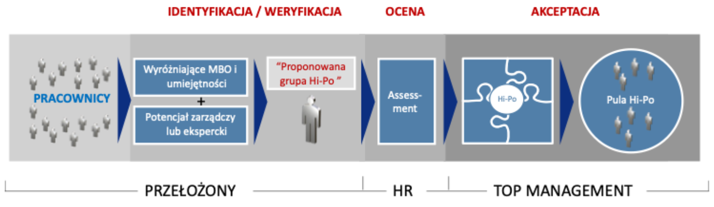 5. Akceptacja – zatwierdzenie szerszej puli kandydatów (hi-po) przez top management wg ścisłych obiektywnych kryteriów.